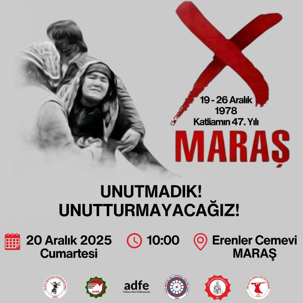 Paylaşılan afişte yer alan bilgilere göre anma programı, 20 Aralık 2025 Cumartesi günü saat 10.00’da Maraş Erenler Cemevi’nde gerçekleştirilecek. Programın, Alevi derneklerinin ortak çalışmasıyla düzenleneceği belirtildi.
